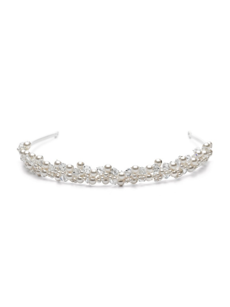 The rhodium plated tiara is embellished with tiny crystals and can be worn with many different hairstyles, like up-dos or braids.