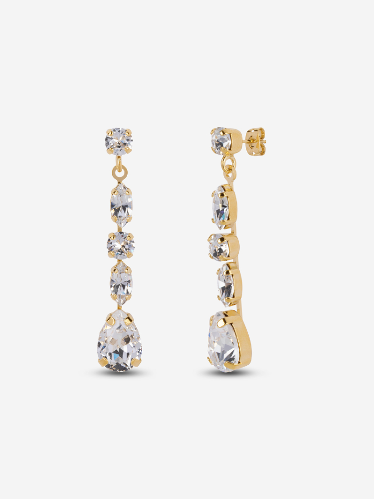 These long gold earrings have clear crystals in a straight line with a larger drop stone at the end. The shapes create a luxury look that fits classic wedding dresses beautifully.