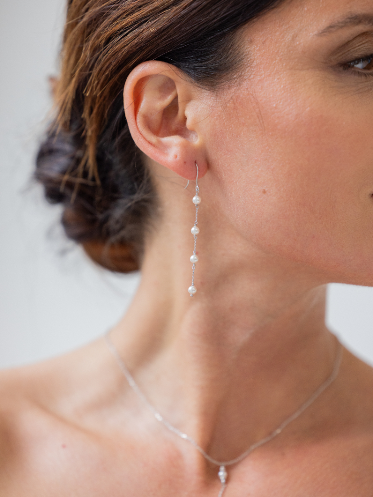 These long silver earrings have a fine chain with four pearls hanging in a straight line. The gentle movement gives a soft and romantic look for classic bridal styles. Made of 925 silver with a protective coating.