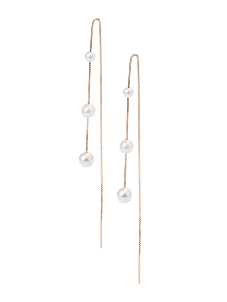 The Maren threader earrings are modern bridal earrings with three beautiful pearls on a 925 sterling silver box chain with rose gold plating. Due to the threader design, the earrings can be worn through multiple piercings for a unique look.