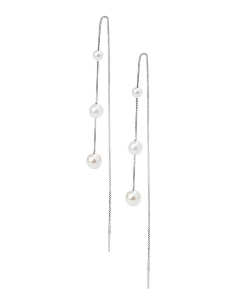 The Maren threaders are modern bridal earrings with three beautiful pearls on a 925 sterling silver box chain with rhodium plating. Due to the threader design, the earrings can be worn through multiple piercings for a unique look.