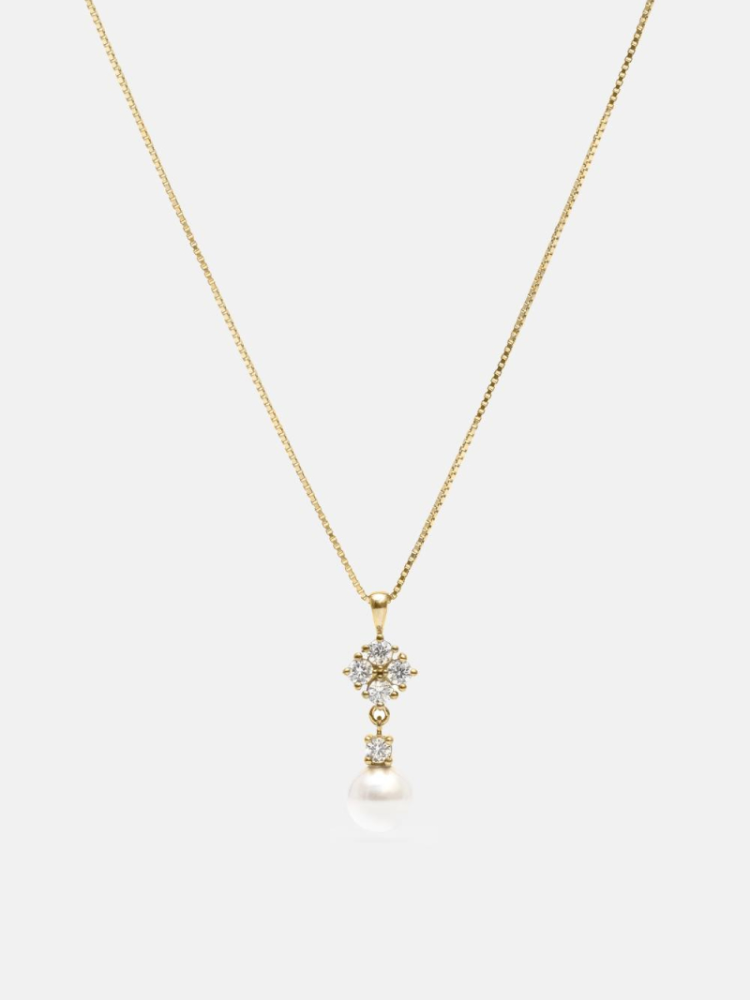 The Romy Gold Necklace is a soft and elegant piece with sparkling crystals and a tiny pearl drop that moves gently as you walk. The small flower design gives it a classic and romantic feel, making it perfect for brides who love a timeless look. Easy to wear and light on the neck, it pairs beautifully with both simple and detailed wedding dresses.