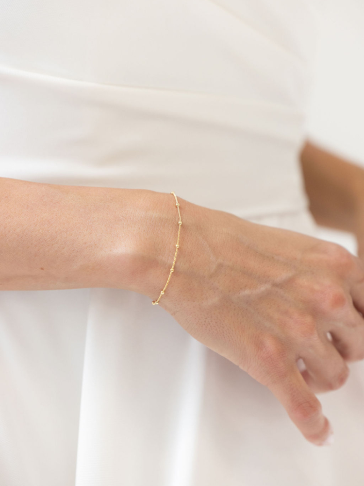 This gold bracelet has a calm, modern look with small gold beads that softly shine on the wrist. Made of 925 silver with a 24k gold layer and an extension chain for a perfect fit. Beautiful for weddings and special moments.