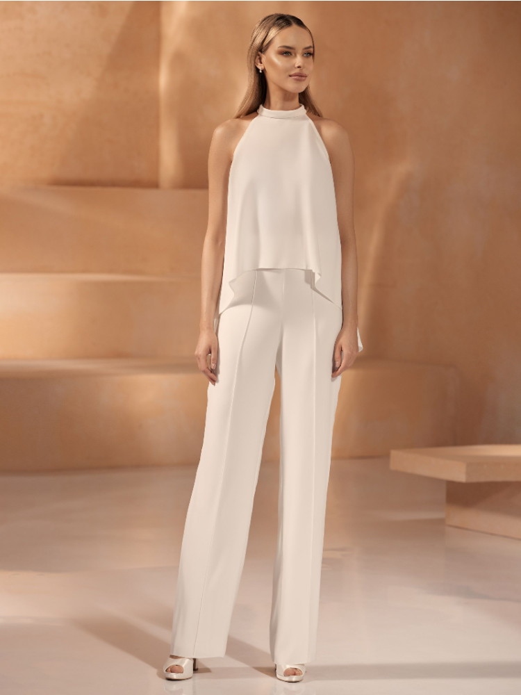 This beautiful bolero is perfect for your wedding day. The top is made from scretch crepe and is sleeveless. The bolero has a lovely round neck.