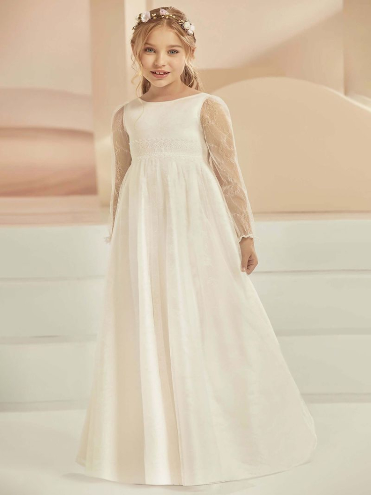 This is a beautiful communion dress made of lace with beautiful details. The dress has a round neckline and sheer sleeves.
