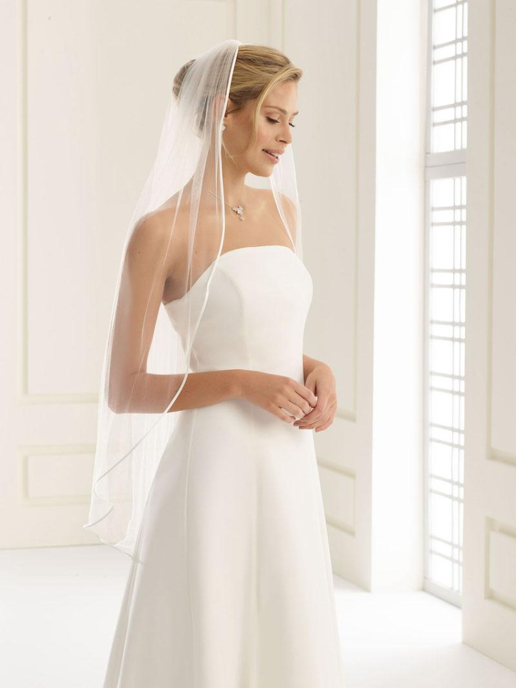 Designed for brides who appreciate simplicity and style, the Bianco Evento S196 Veil in soft tulle offers a mid-length, single-layer design measuring 110 cm with a beautiful plain satin edge. It comes with the comb already attached for easy incorporation into your hairstyle.
