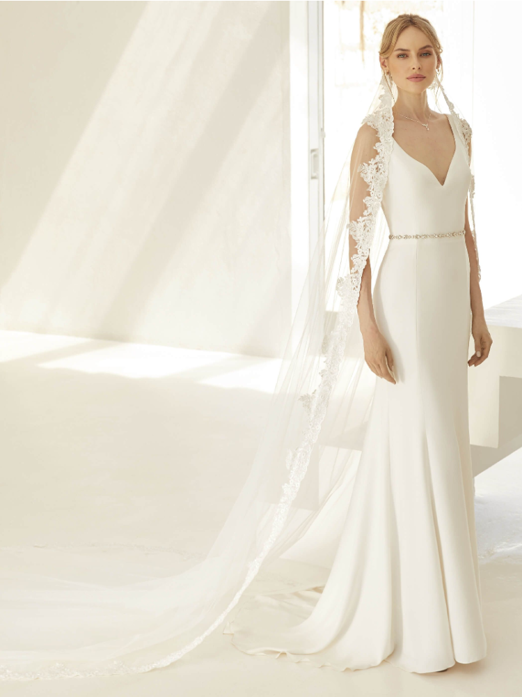 Choose the Bianco Evento S425 veil for a touch of elegance. This extra-long, single-layer veil in diamond tulle measures 300 cm and has a lace edge adorned with glass beads. Comes with a comb for effortless styling.