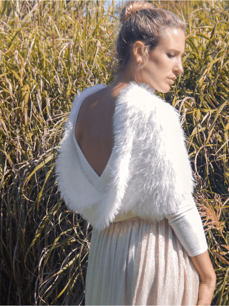 This beautiful fluffy scarf with a softly loop with rotation is perfect for your wedding day. It is very stretchy and soft quality. The scarf caresses your arms and keeps you nice and warm. This bridal knitwear is lovely for a winter or autumn wedding. The loop with rotation has a circumference from 110 cm. You can wear this nice stola with the loop at the front and the back.