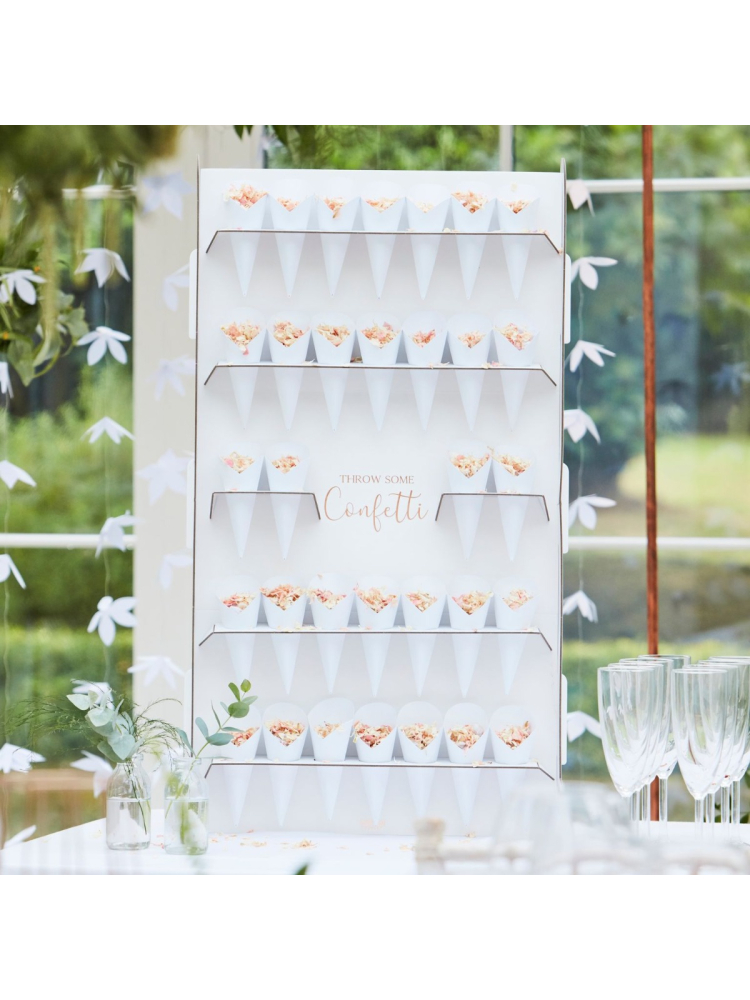 The wall is made of cardboard in white and is supplied for easy assembly. On the board is the text Throw some confetti in rose gold letters.