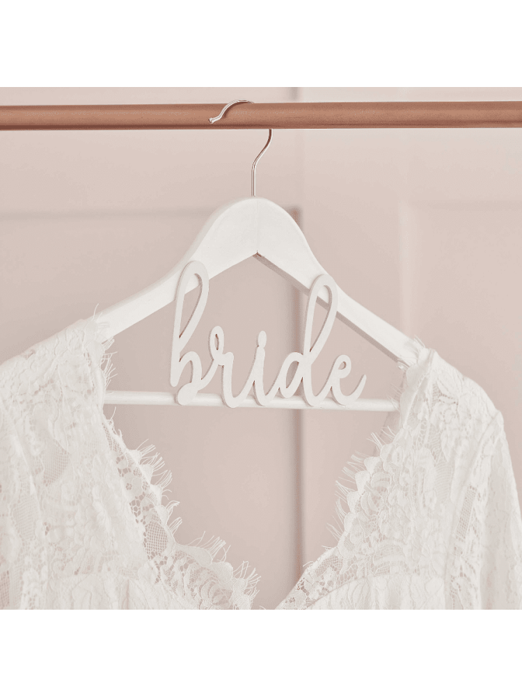 On your wedding it is all about the finishing touches for the most perfect and magical day! Get ready in style for your big day with this beautiful Bride clothes hanger. The bride can hang her dress on it, while getting ready. Furthermore, this wedding dress hanger made of white wood will look beautiful in your morning wedding photography.