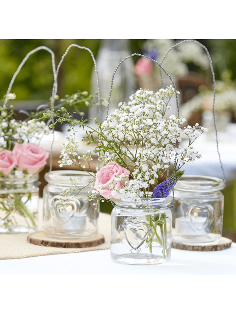 The glass tealight holders have a heart shape embellished into the glass - the metal wire allows you to hang the tealight from branches, nails and hooks. Match the tealight holders with other wedding decorations from the Rustic Country collection.