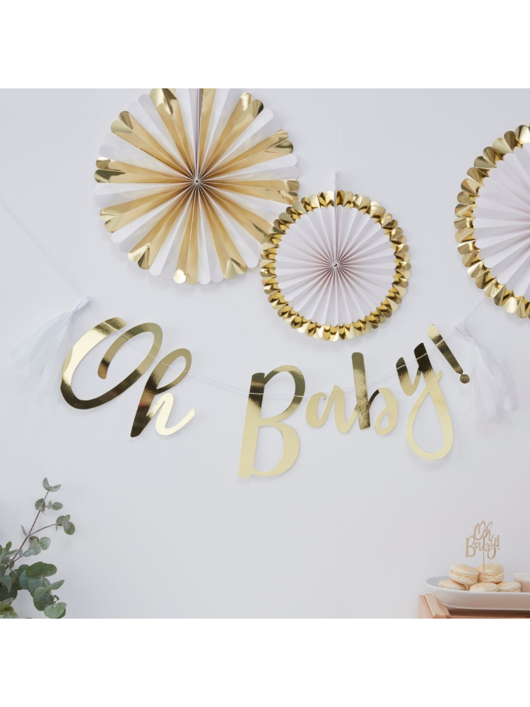 This gold foil Oh Baby sling is a must have for the baby shower. Hang the sling so that the mommy to be immediately sees that she is on her baby shower.