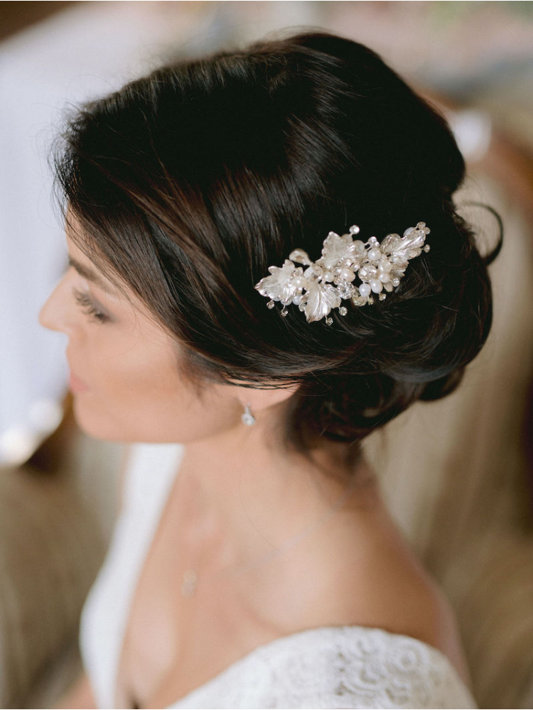 Beautiful bridal hair comb with silver plating from G.Westerleigh, made by hand and decorated with treasured rhinestones, silver leaves and ivory faux pearls.