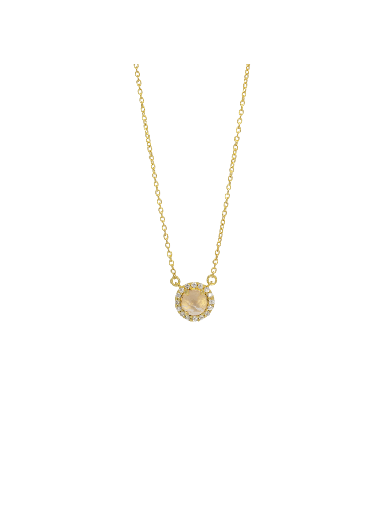 The highlight of this necklace is a round rose quartz pendant, prominently framed by numerous small crystals.
