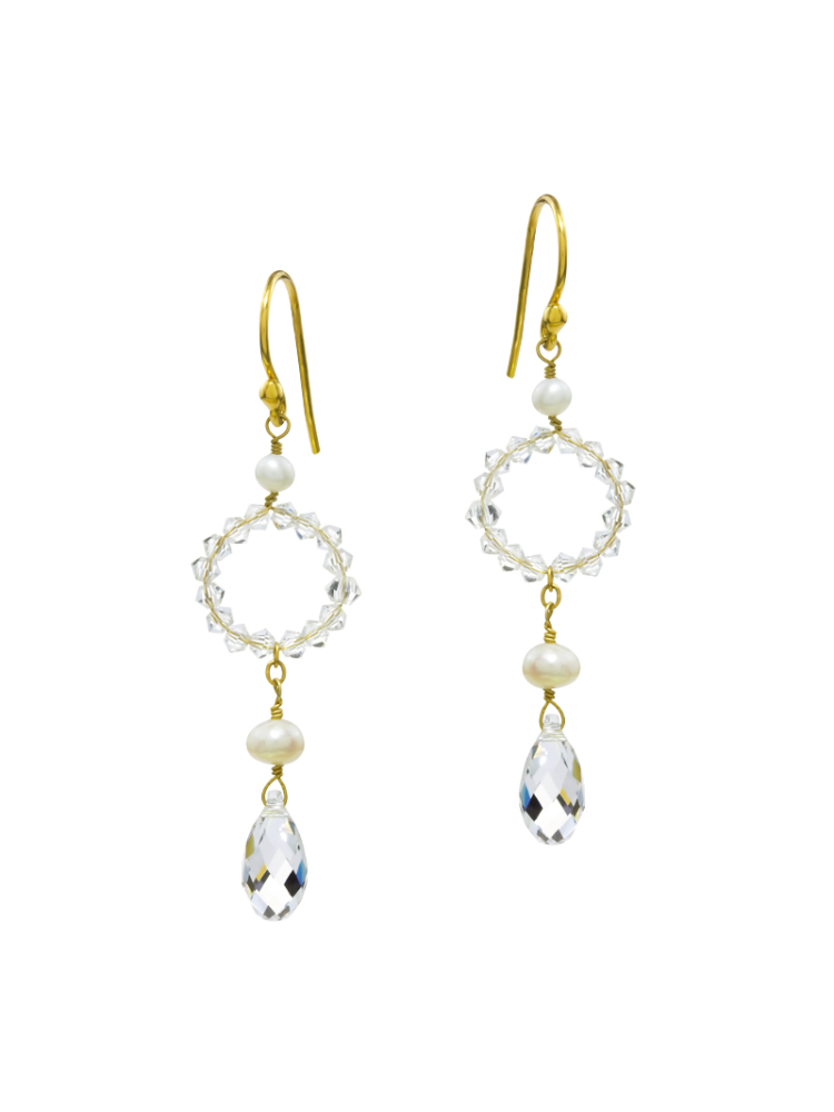 These earrings make the dream of perfect bridal jewelry come true: a circle of sparkling crystals reminiscent of a wedding ring, framed by two precious freshwater pearls, with a teardrop-shaped crystal as the crowning touch.