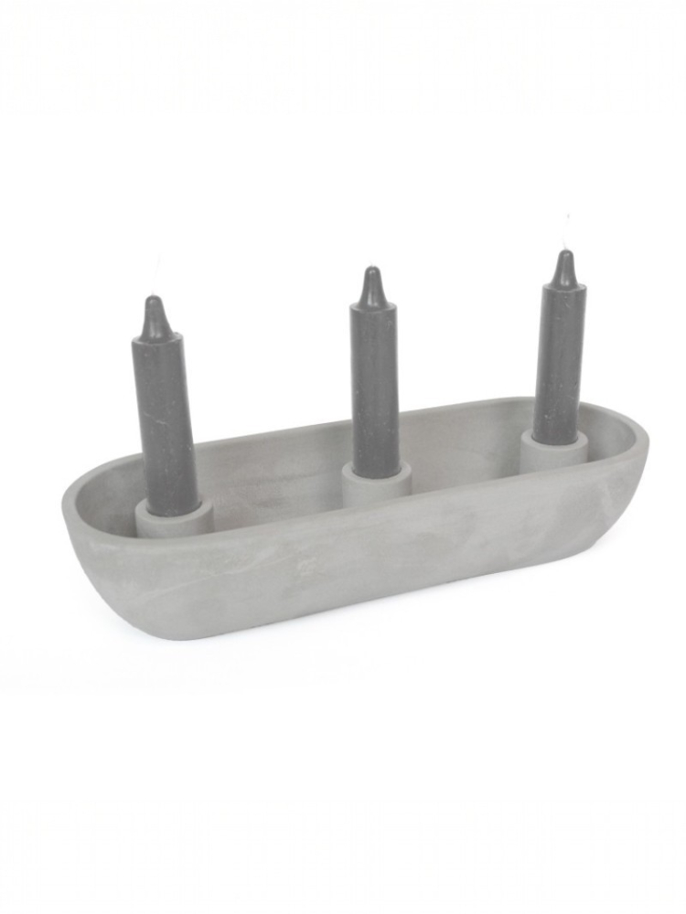 Handcast from smooth cement in a soft grey, the Carice measures 27 x 10 x 6 cm and cradles three tall taper candles with a sturdy, architectural silhouette; a smaller single-candle version is available for more intimate settings.