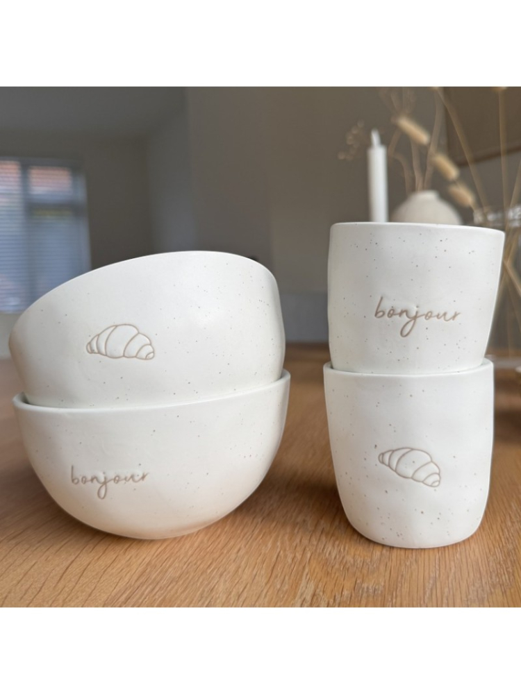 - Two charming bowls: one with a pastry illustration, one with the word "Bonjour"