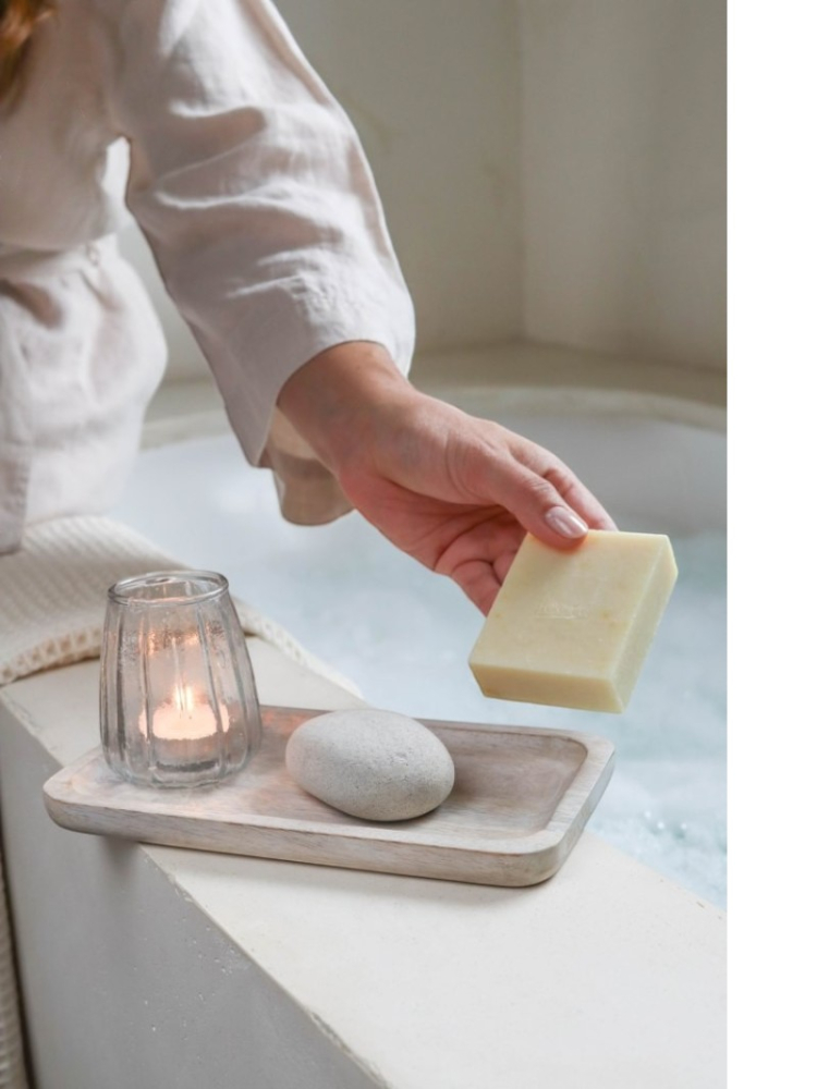 Working in harmony, the stone exfoliator focuses on rough spots while the soap lathers easily to reveal touchably soft, glowing skin. The calming, refreshing cleanse feels like a small spa moment at home, perfect for unwinding around joyful celebrations.