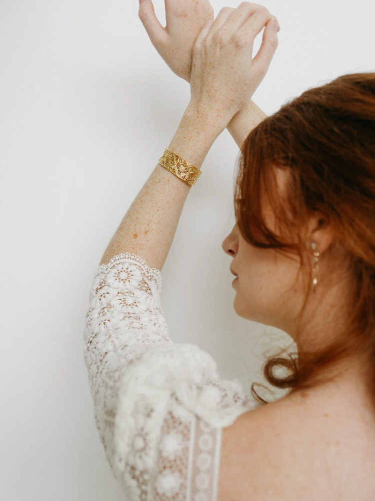 The Ottoman bracelet by Lizeron is a gold-plated brass piece with an intricate French-crafted design. It’s elegant and timeless. It adds character to any outfit.
