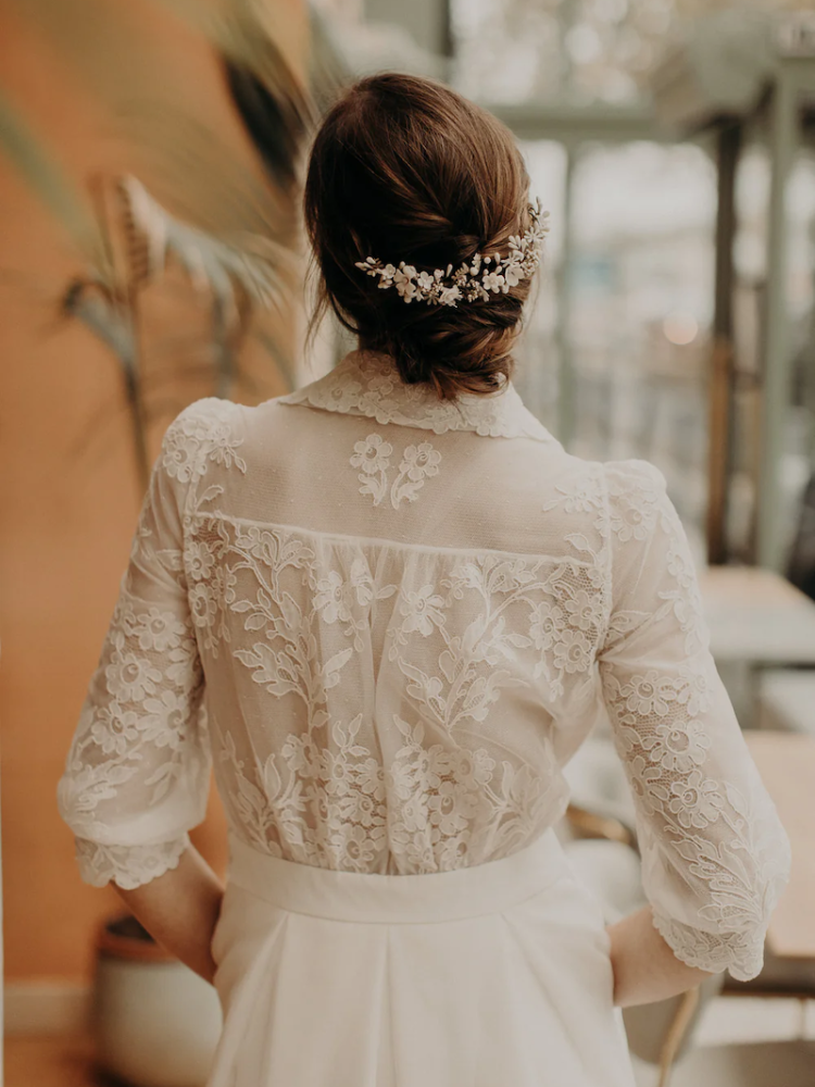 The Perrine hair comb by Lizeron is a handcrafted accessory that adds a romantic touch to any hairstyle. Measuring 20 cm, it features delicate porcelain elements, carefully arranged for an elegant look. Designed to blend seamlessly into the hair, it is secured with hairpins for a natural, refined style. It’s a timeless piece that brings classic charm and modern elegance to any occasion.