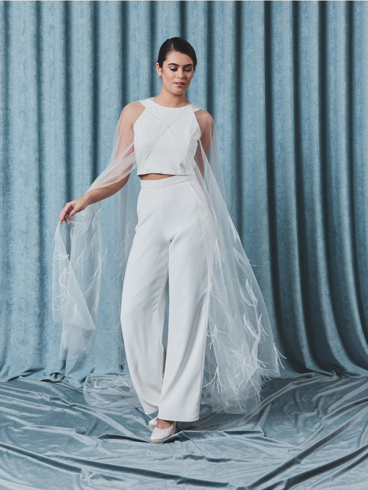 Fastened at the front with a subtle crystal button, the Poirier C-75106 Cape blends opulence with refined sophistication. Its light, transparent structure ensures it complements your silhouette without overwhelming it, while the luxurious feather details bring movement and high-fashion flair. Ideal for brides seeking something extraordinary, this cape is perfect for ceremonies or stylish bridal portraits, and adds a couture-inspired finishing touch to both dresses and separates.