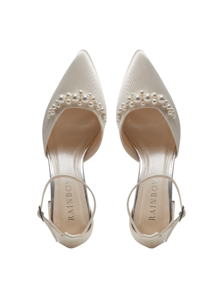 Rainbow Club Aurelia wedding shoes combine timeless elegance with refined bridal comfort. Crafted in soft ivory satin with delicate pearl embellishments, these heels add a romantic finishing touch to your wedding look.