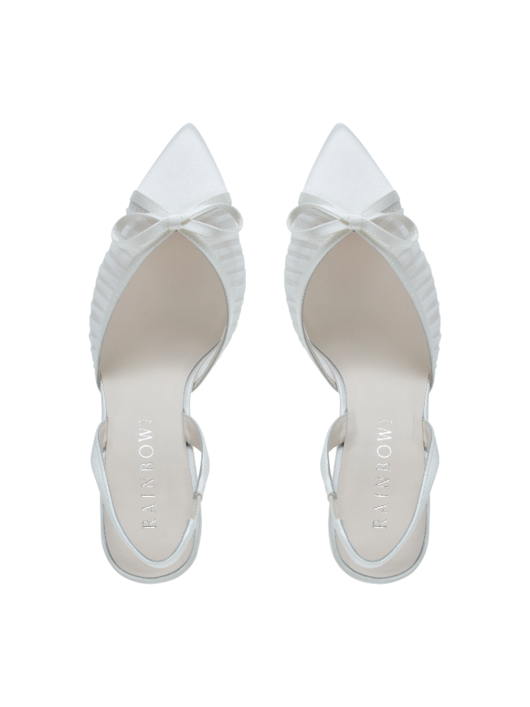 Fall in love with Donatella, the perfect slingback for modern brides, combining elegance with comfort. These pointed pair feature a delicate satin bow at the vamp, set on an ultra-wearable mid 7cm stiletto heel. Crafted with precision, they add a romantic touch to any gown, making them a must-have for any bride. Something Blue As with all Rainbow Club branded bridal shoes, you’ll discover a hidden blue crystal in the soles as your ‘something blue’. This thoughtful finishing touch is our tiny token of good luck on your special day and a true mark of Rainbow Club authenticity.