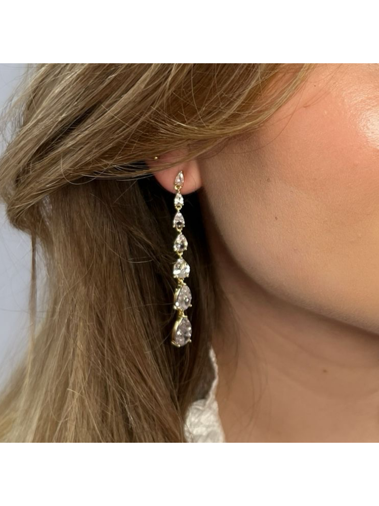 Add a glamorous touch to your bridal look with the Ella Gold Earrings from Sally Jane Bridal. These radiant earrings feature cascading zirconia crystals in a refined drop design, plated in a warm golden finish that catches the light from every angle. The delicate detailing ensures they shimmer beautifully without overwhelming your look, creating the perfect balance between statement glamour and timeless elegance. Ideal for brides who want to add a bold yet refined accent, these earrings complement both minimalist gowns and ornate bridal styles. A truly versatile piece designed to be treasured beyond the wedding day.